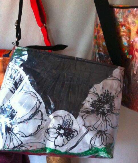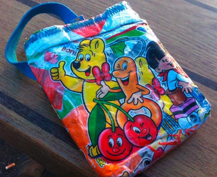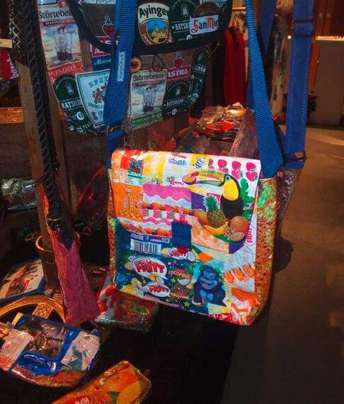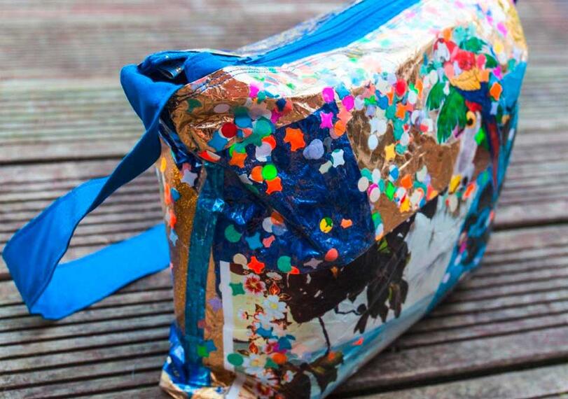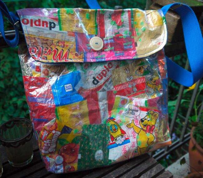 Ich fertige dekorative Trage-und Umhängtaschen für den alltäglichen Gebrauch auf Basis von Verpackungsmaterial (Bonbonpapier, Tetrapacks, Umverpackungen usw.)